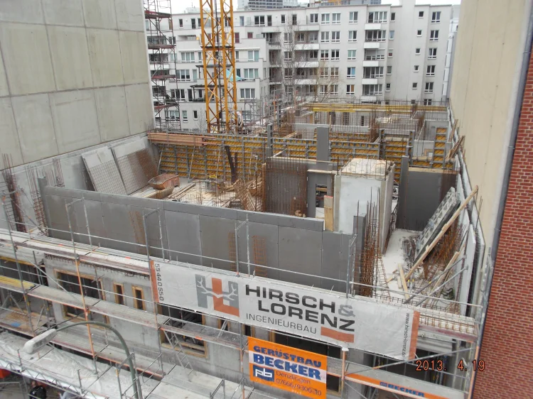 Bereits im 17. Jahrhundert wurde die Alte Jakobstraße bebaut. Zentral zwischen den Bezirken Kreuzberg und Mitte gelegen, ist sie heute eine begehrte Wohnstraße in unmittelbarer Nähe zur Berliner Stadtmitte. Hirsch + Lorenz realisiert hier den Rohbau für ein siebengeschossiges Wohnhaus und eine angeschlossene WU-Beton-Tiefgarage.