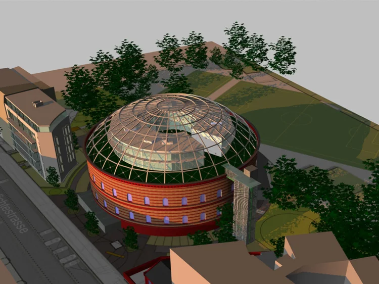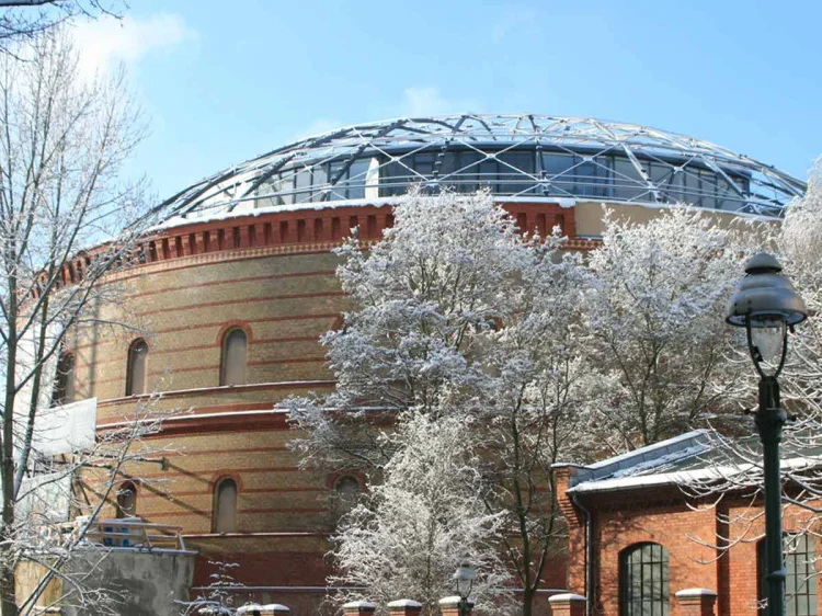 Wohnen in Top-Lage: Erweiterter Rohbau eines kreisförmigen Neubaus (Circlehouse) auf dem Dach des denkmalgeschützten Gasspeichers in der Fichtestraße mit 1.600 m² Wohnfläche. Außerdem: erweiterter Rohbau eines Wohnhauses (Lofthouse) mit 1.200 m² Wohnfläche und Neubau einer WU-Beton-Tiefgarage mit 1.000 m² Grundfläche.