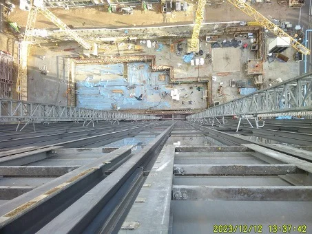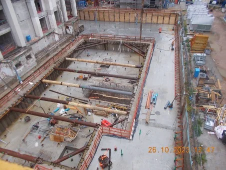 Die neu geplante Sockelzone besteht aus einem Erdgeschossbereich, zwei Untergeschossen und einem vom 1. Obergeschoss aus zugänglichen Dachbereich. Der Neubau im Bereich des zweiten Untergeschosses wird im Schutz eines wasserspendenden Trogs aus Bohrpfahlwänden und HDI-Sohle errichtet.