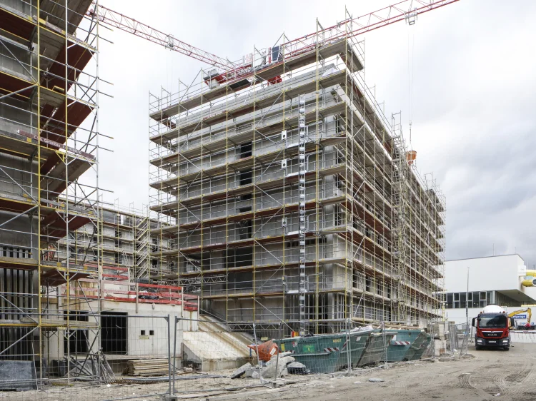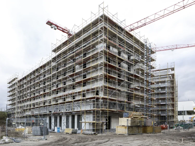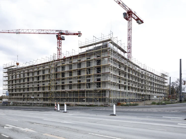 Das Fundament wird als weiße Wanne aus WU-Beton erstellt. Als Besonderheit wird unter der Bodenplatte eine Schwingungsentkopplungsmatte eingearbeitet. Die Matte wird den Neubau vor der Erschütterung, die durch eine direkt entlangfahrende Straßenbahnlinie entsteht, schützen.
