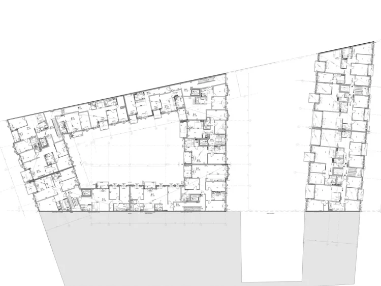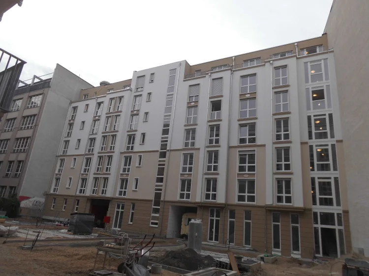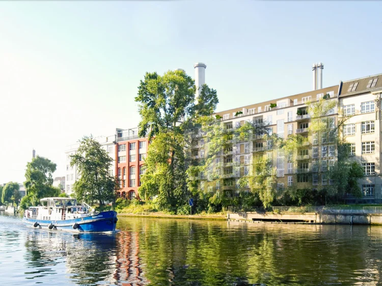 Eine echte Herausforderung: Im Zentrum Berlins, direkt an der Spree, wurde eine Wohnanlage mit insgesamt 123 Eigentumswohnungen, verteilt auf sieben Wohnblöcke, und einer verbindenden Tiefgarage als WU-Konstruktion neu errichtet. Aufgrund der beengten, einseitigen Zufahrt durch die Wasserlage bestanden außergewöhnliche Anforderungen an die Baustellenlogistik. Weil das gesamte Projekt in einer Baulücke erstellt wurde, musste der Großteil der Materialtransporte von Kran zu Kran durchgeführt werden.