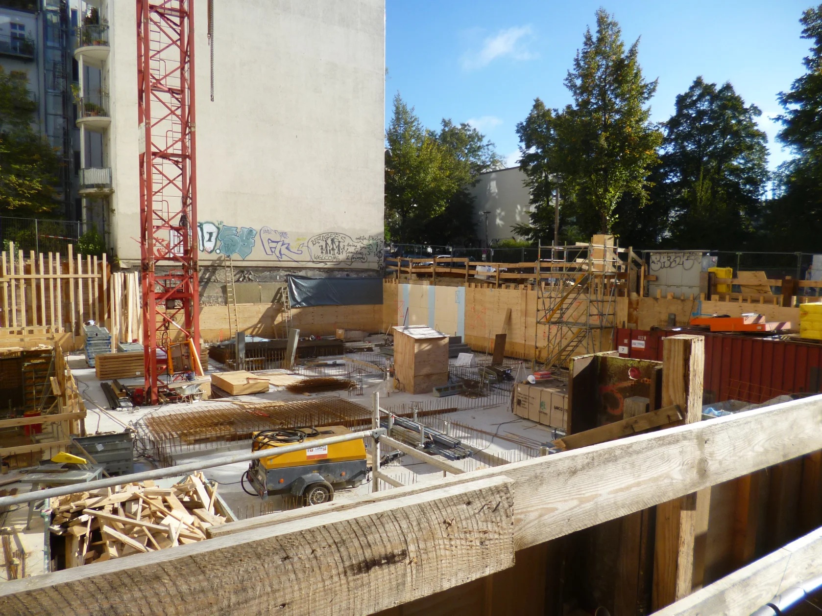 Neubau von 39 Eigentumswohnungen, 3 Gewerbeeinheiten und einer Tiefgarage in WU-Bauweise als Eckbebauung mit Lückenschluss an die Nachbarbebauung verteilt auf Erdgeschoss, 5 Normalgeschosse und 1 Staffelgeschoss.