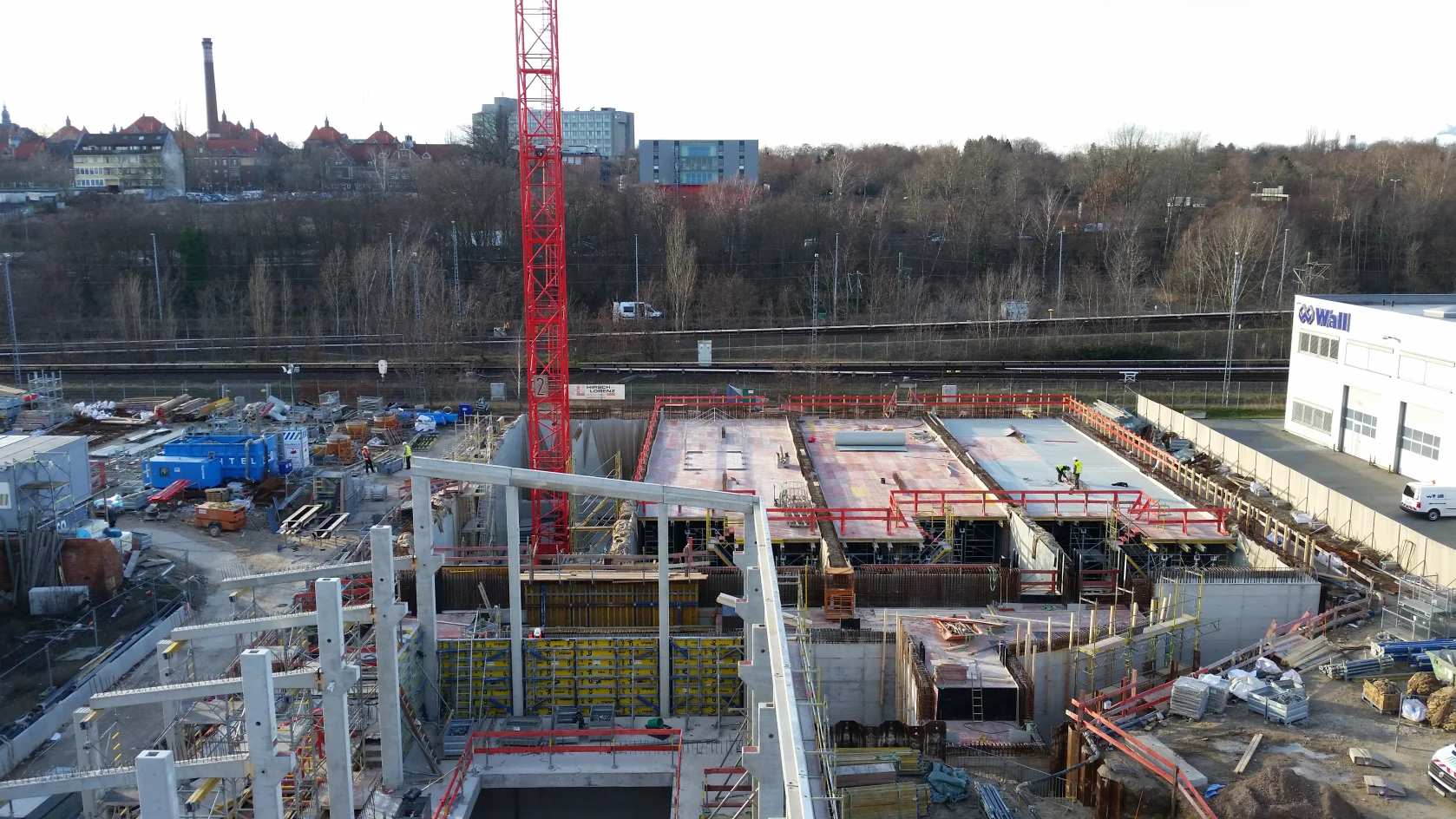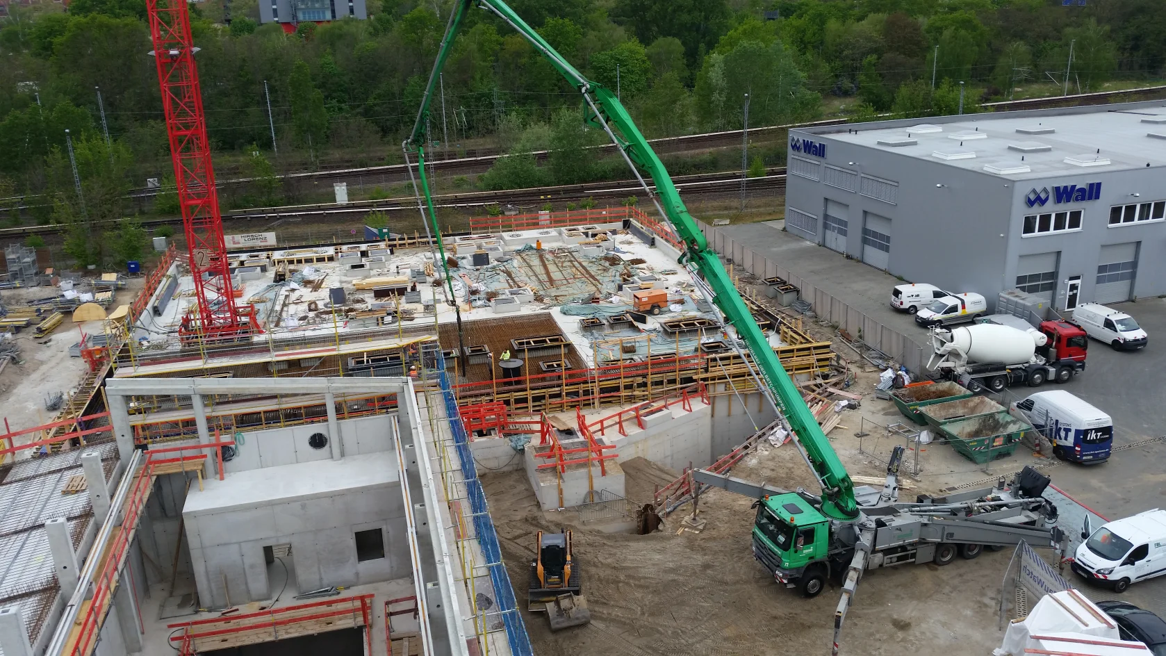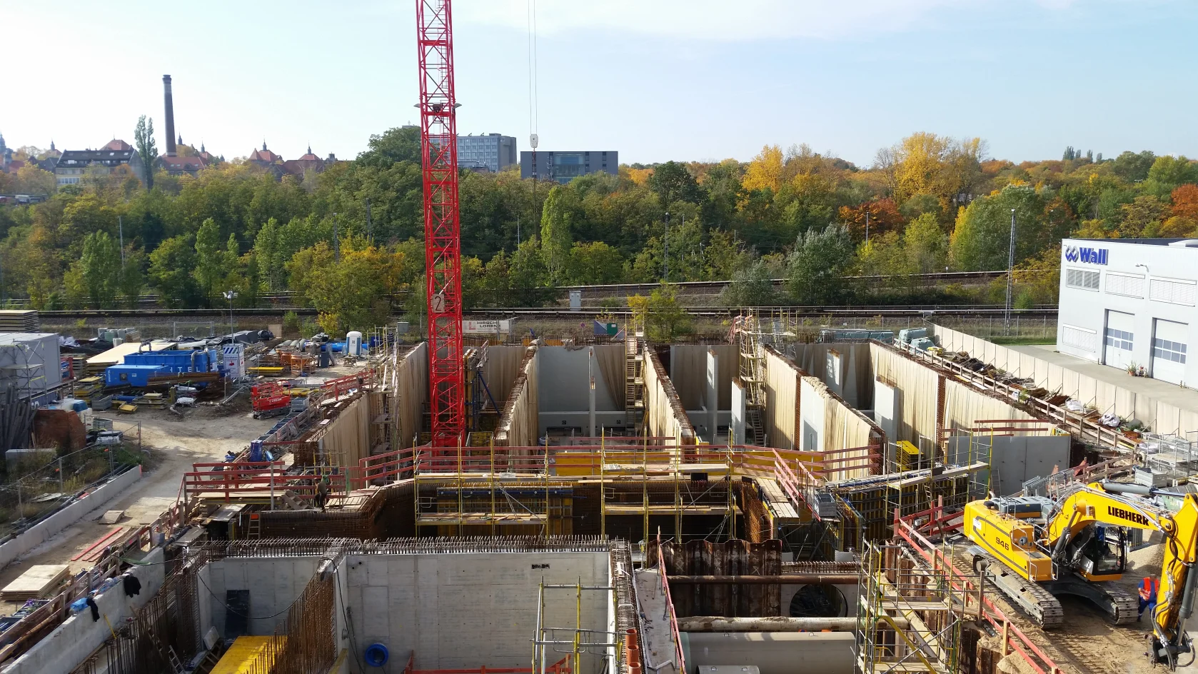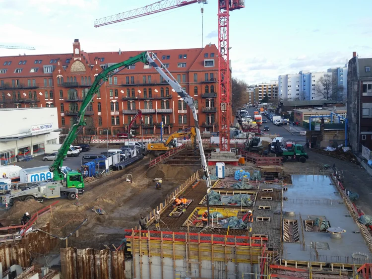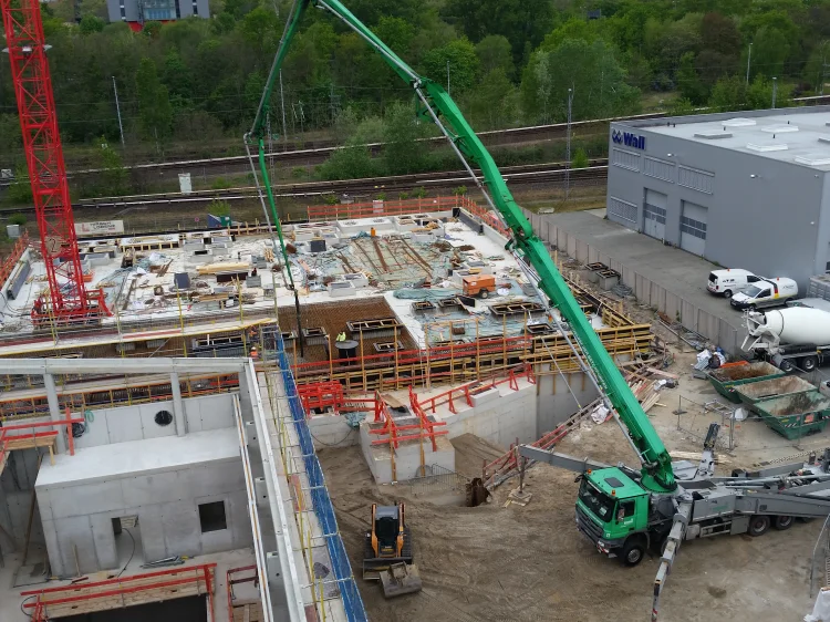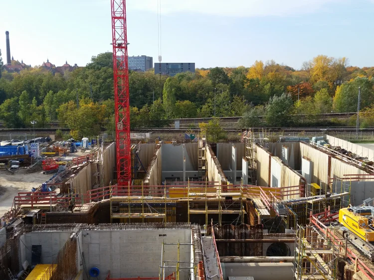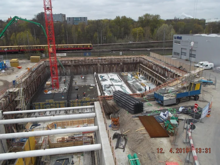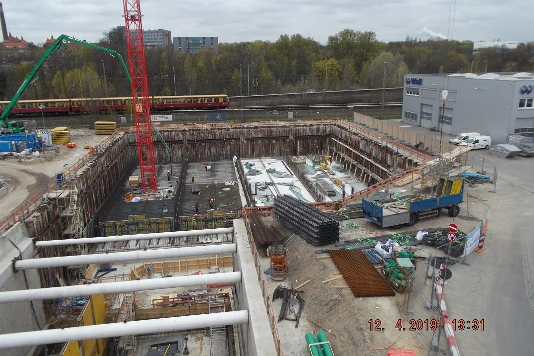 Bereits im Dezember 2017 Jahres erhielten wir als Bietergemeinschaft Hirsch + Lorenz Ingenieurbau und Bauer Spezialtiefbau den Zuschlag. Unter Führung der Arge durch Hirsch + Lorenz startete gleich die Ausführungsplanung für die Spezialtiefbauarbeiten. Im Jahr 2018 wurden die Baugruben für das Regenüberlaufbecken, das eigentliche Pumpwerk und den Leitungsbau durch unseren Partner Bauer Spezialtiefbau errichtet. 2019 sind die Stahlbetonrohbauarbeiten terminiert, so dass im September 2020 die durch die Arge errichteten Bauwerke an die Berliner Wasserbetriebe übergeben werden können. Bis zu diesem Zeitpunkt sind dann 1.500 m² Schlitzwand, 4.500 m² Dichtwand mit eingestellter Spundwand, 2.900 m² Dichtsohle, 1.900 m temporäre Litzenanker, 9.000 m³ Stahlbeton, 24.000m² Decken- und Wandschalung sowie 900t Bewehrung verbaut. Im Februar wurde nun der erste Turmdrehkran im Bereich des Pumpwerks aufgebaut, so dass mit der Herstellung der ersten Stahlbetonsohle unmittelbar begonnen werden kann.