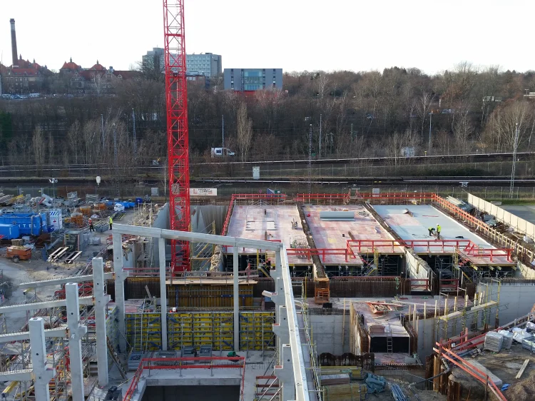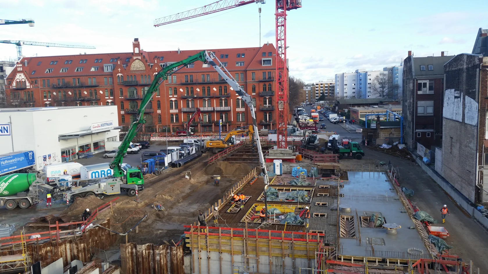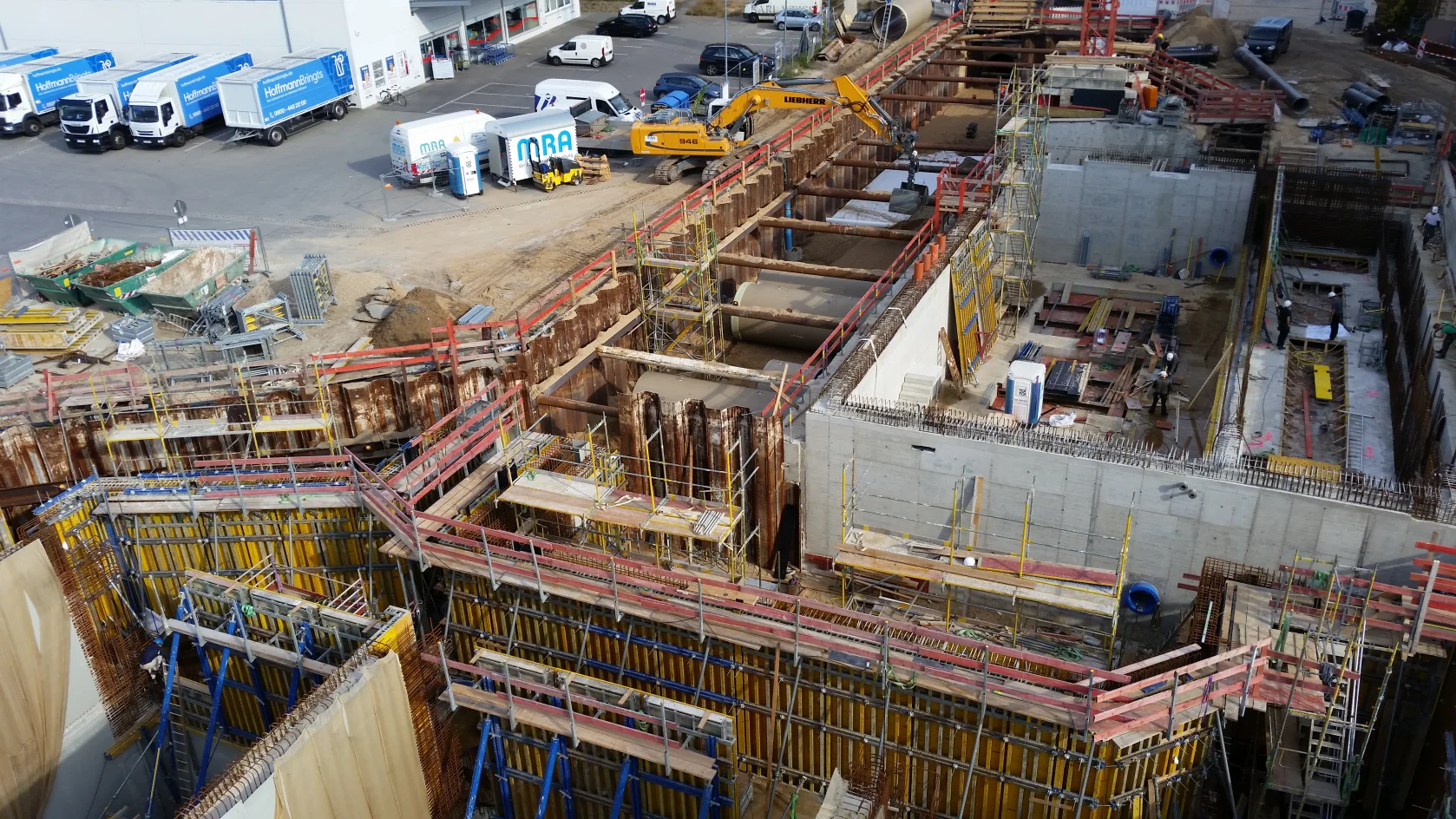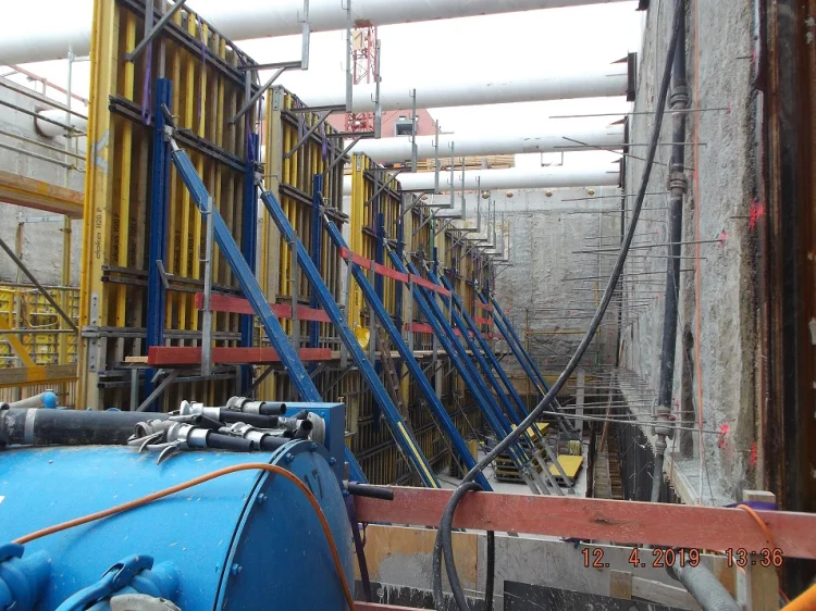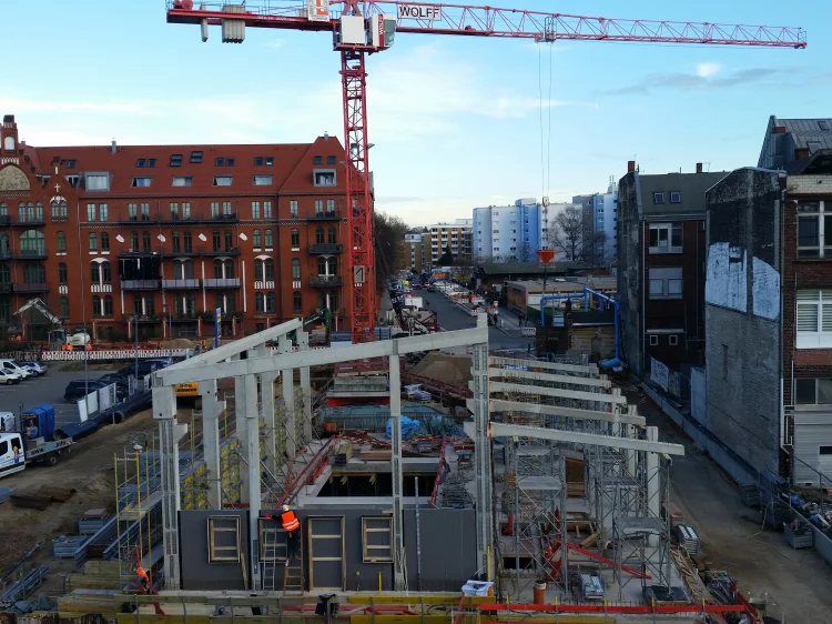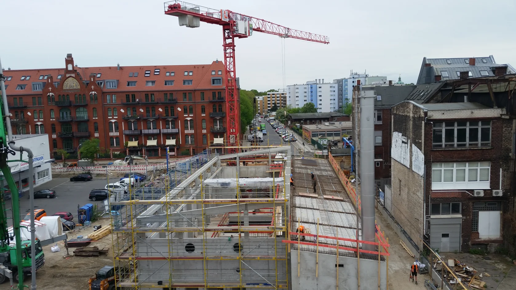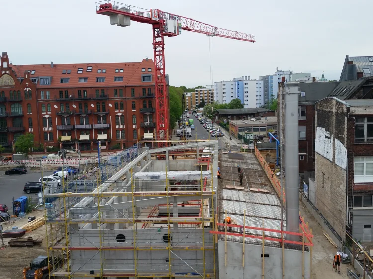 Bereits im Dezember 2017 Jahres erhielten wir als Bietergemeinschaft Hirsch + Lorenz Ingenieurbau und Bauer Spezialtiefbau den Zuschlag. Unter Führung der Arge durch Hirsch + Lorenz startete gleich die Ausführungsplanung für die Spezialtiefbauarbeiten. Im Jahr 2018 wurden die Baugruben für das Regenüberlaufbecken, das eigentliche Pumpwerk und den Leitungsbau durch unseren Partner Bauer Spezialtiefbau errichtet. 2019 sind die Stahlbetonrohbauarbeiten terminiert, so dass im September 2020 die durch die Arge errichteten Bauwerke an die Berliner Wasserbetriebe übergeben werden können. Bis zu diesem Zeitpunkt sind dann 1.500 m² Schlitzwand, 4.500 m² Dichtwand mit eingestellter Spundwand, 2.900 m² Dichtsohle, 1.900 m temporäre Litzenanker, 9.000 m³ Stahlbeton, 24.000m² Decken- und Wandschalung sowie 900t Bewehrung verbaut. Im Februar wurde nun der erste Turmdrehkran im Bereich des Pumpwerks aufgebaut, so dass mit der Herstellung der ersten Stahlbetonsohle unmittelbar begonnen werden kann.