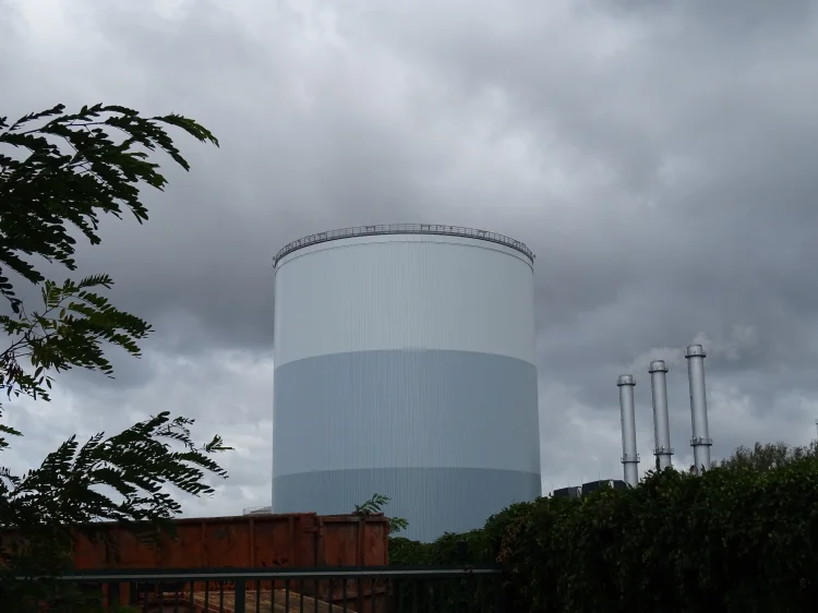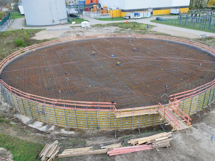 Eine runde Sache: Beauftragt wurden der Neubau einer Gründung und Fundamentplatte für einen Wärmespeicher. Die Platte mit einem Durchmesser von 44 Metern und einer Dicke von 2,50 Metern weist eine Gesamtkubatur von 3.850 m³ mit 600 t Bewehrungsstahl auf, die in einem Arbeitsgang innerhalb von 24 Stunden betoniert werden musste. Die Platte gründet sich auf 211 neu zu erstellenden Bohrpfählen mit bis zu 17 Metern Länge und einem Durchmesser von 88 Zentimetern.
